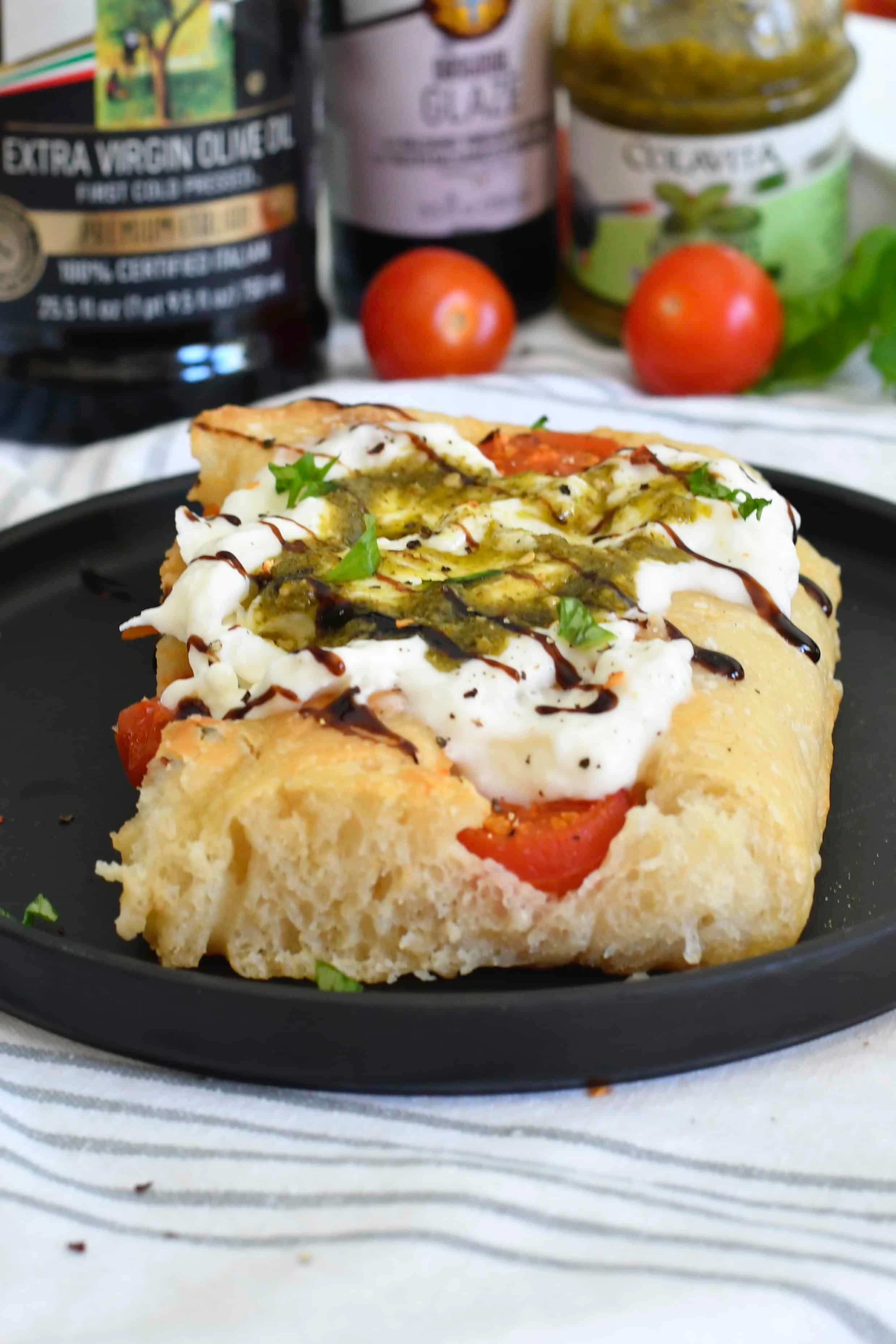 Easy No-Knead Caprese Focaccia with Burrata, Pesto & Balsamic Glaze